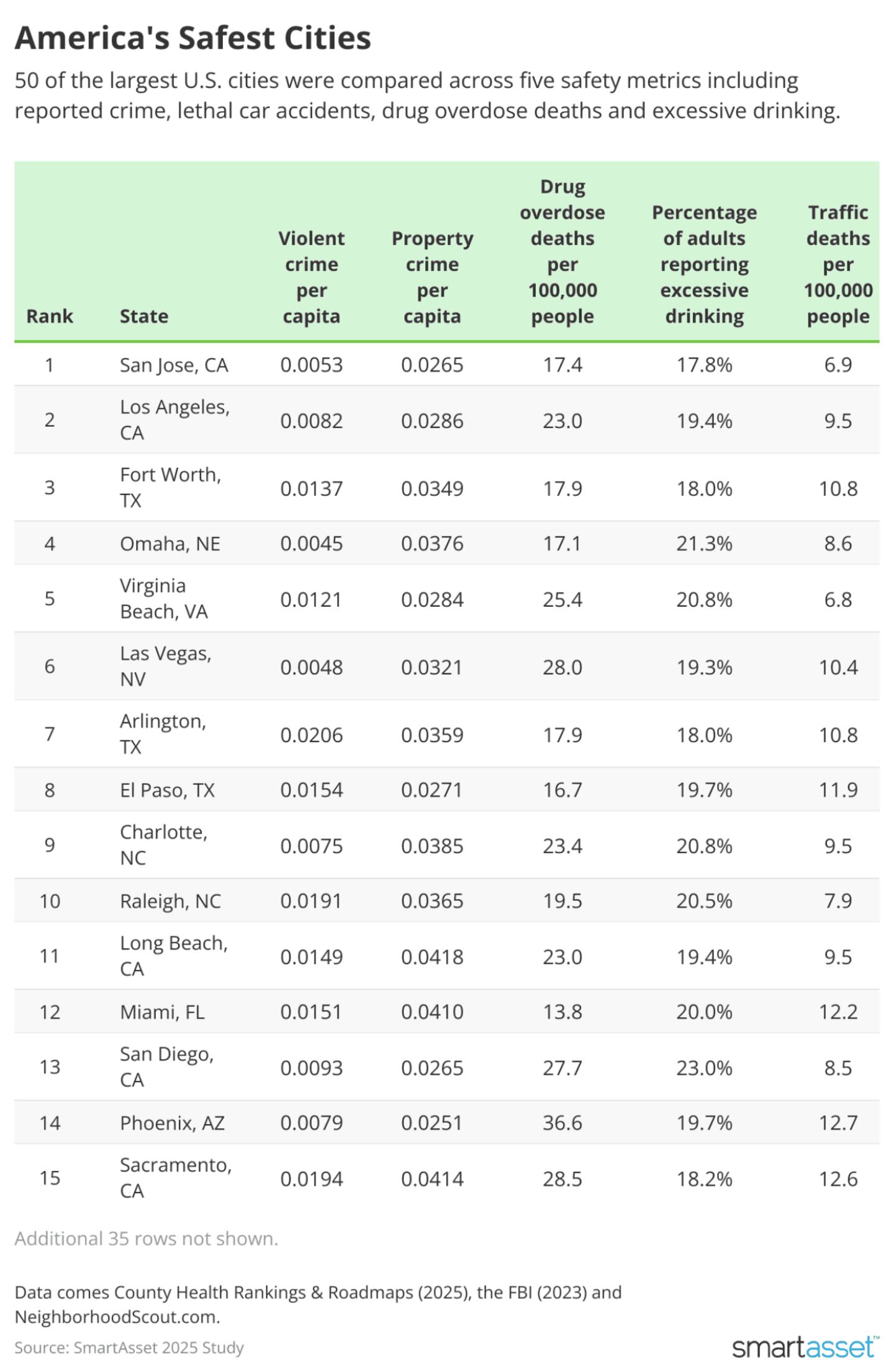 To determine the safest cities, SmartAsset compared data for 50 of the largest U.S. cities by population (U.S. Census Bureau, 2023), ranking them by the following metrics: