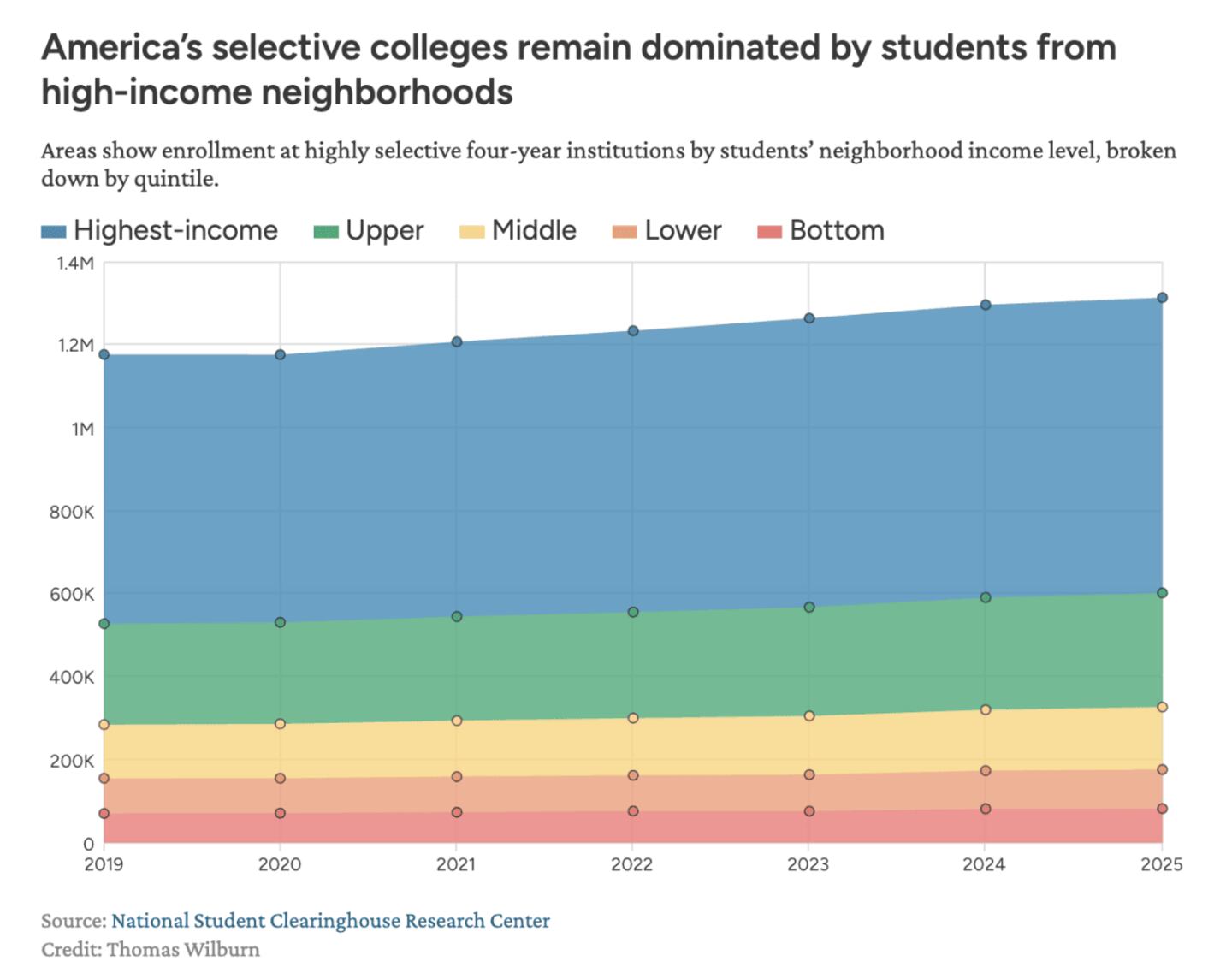 Total enrollment at “highly selective” colleges has been going up in recent years, but the economic background of the student body has barely budged. The share of students from the two groups of lower-income neighborhoods has shifted from 13.2% in 2019 to 13.4% in 2025. In raw numbers, that’s an uptick of about 20,000 students, which is far less than the 95,000 student increase from the two highest-income neighborhoods.
