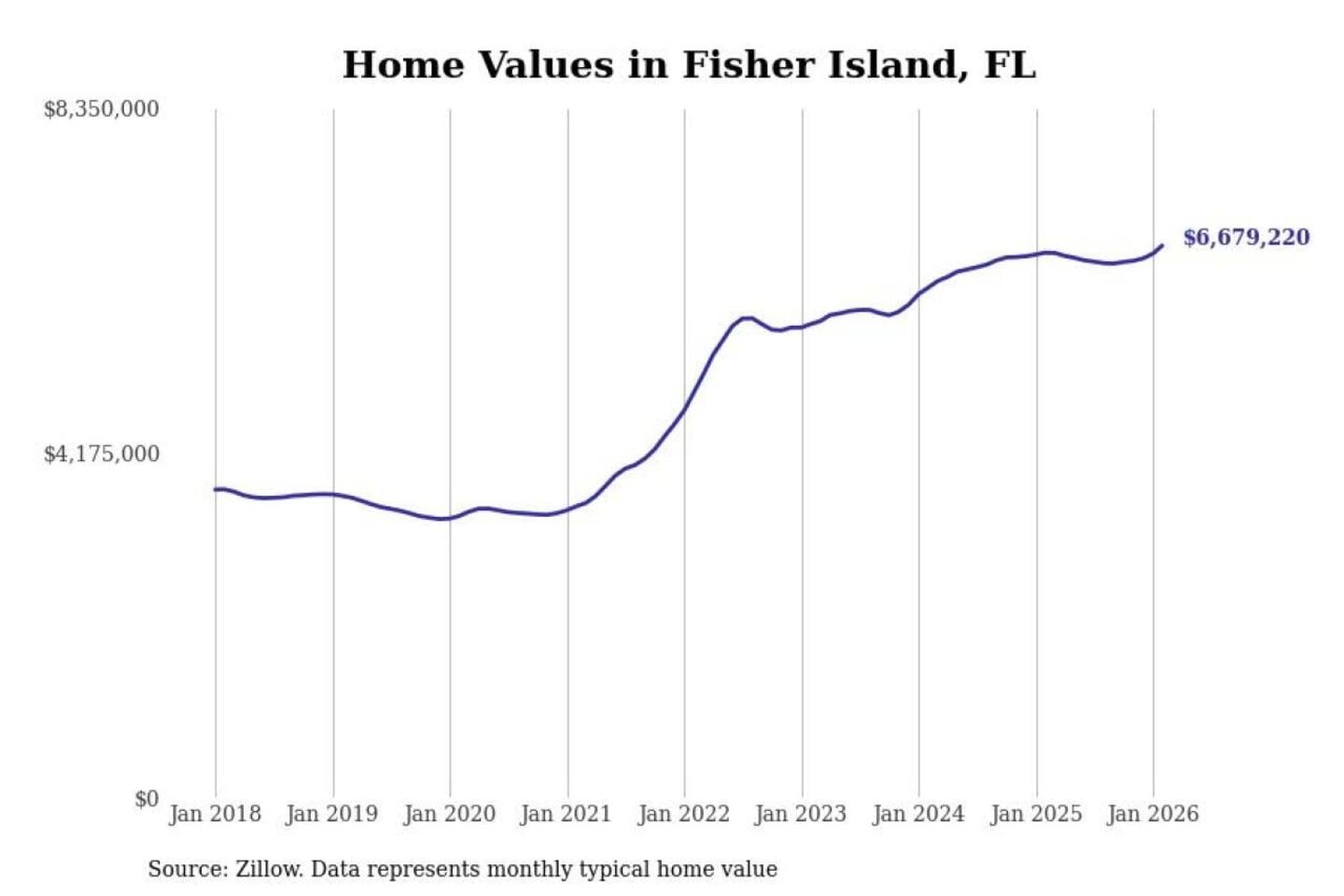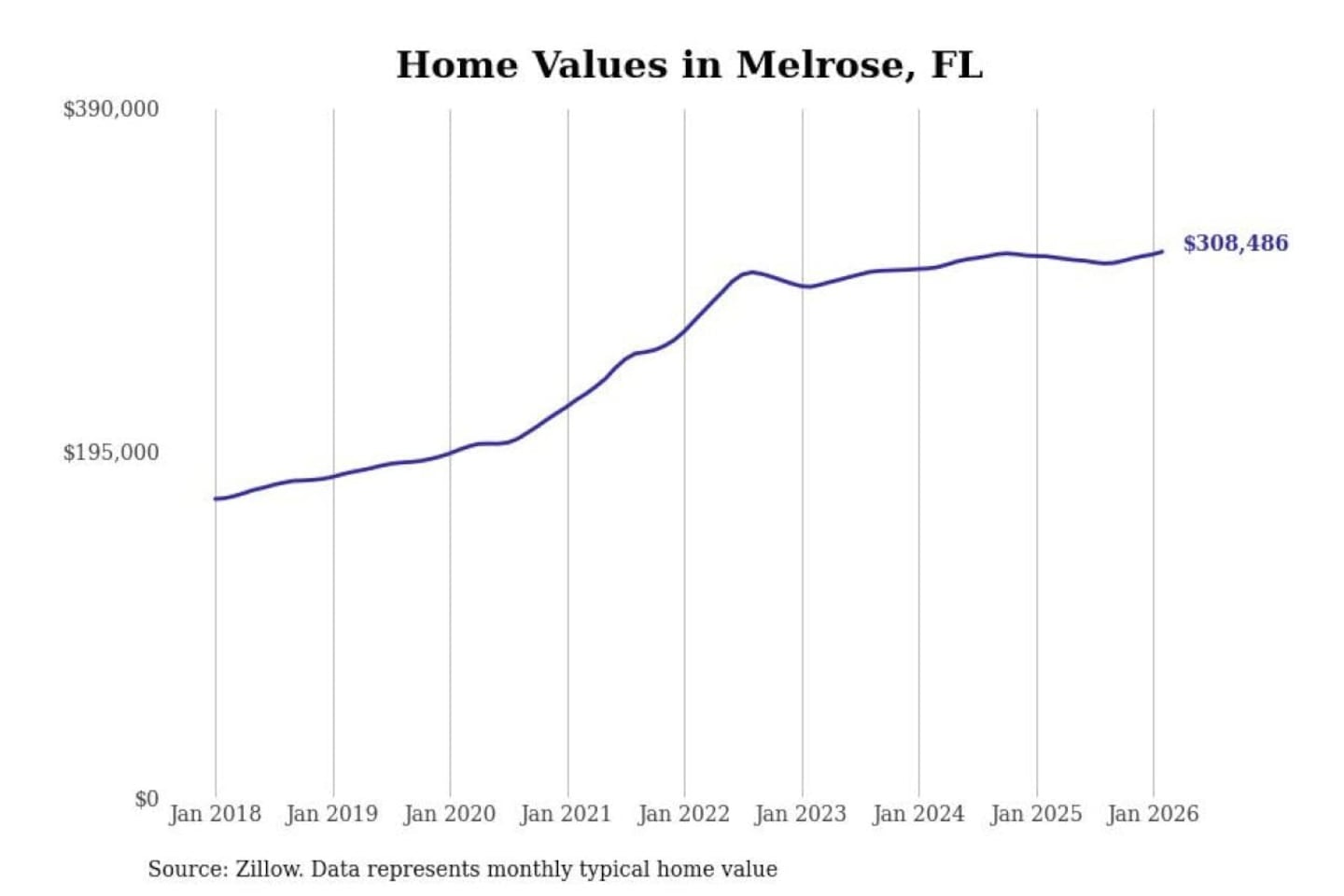 Stacker compiled a list of cities with the fastest-growing home prices in Florida using data from Zillow. Cities are ranked by the dollar change in the Zillow Home Values Index for all homes from the 12 months ending February 2026. The charts in this story were created automatically using Matplotlib. Data was available for 50 cities and towns in Florida.