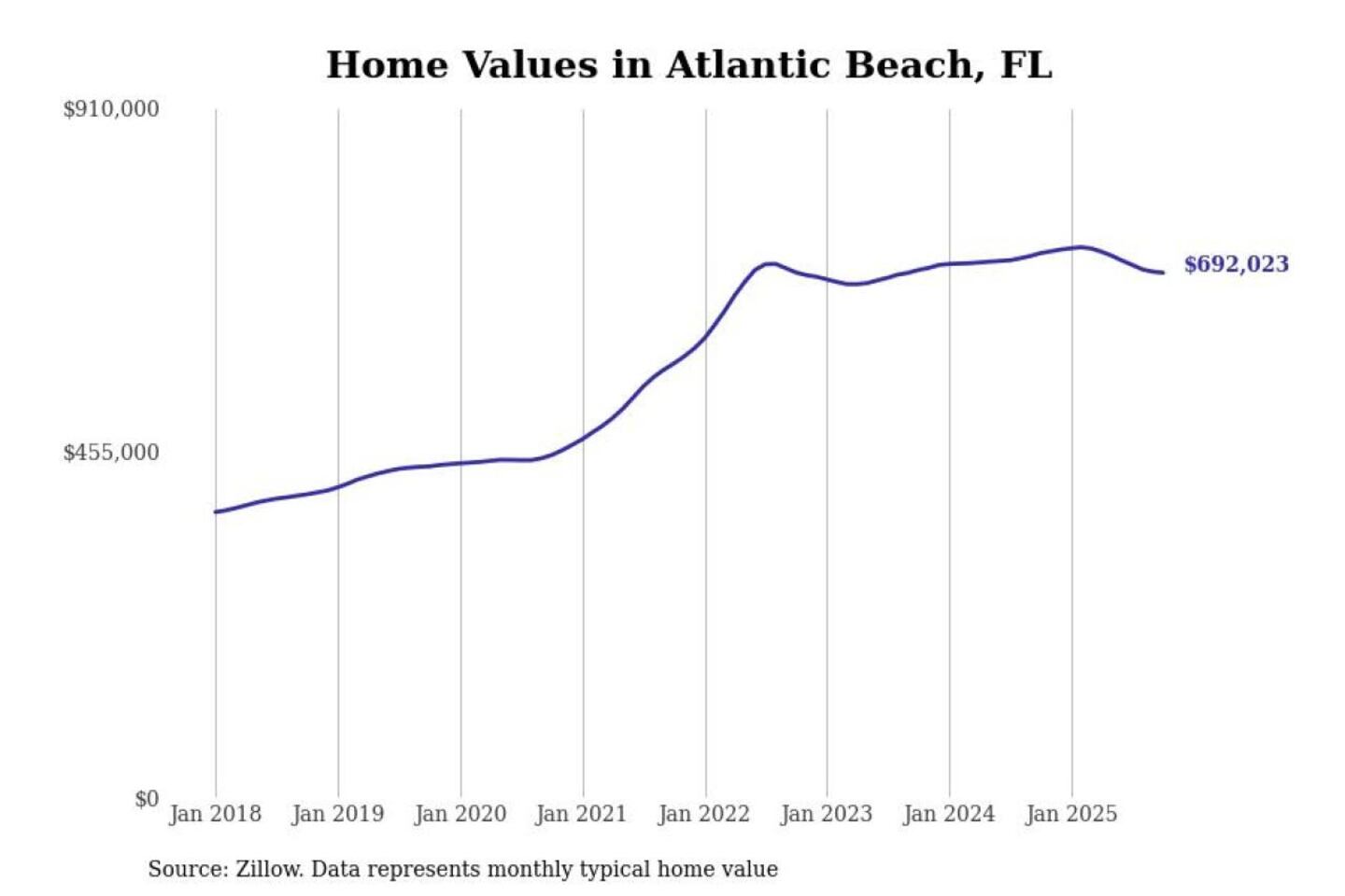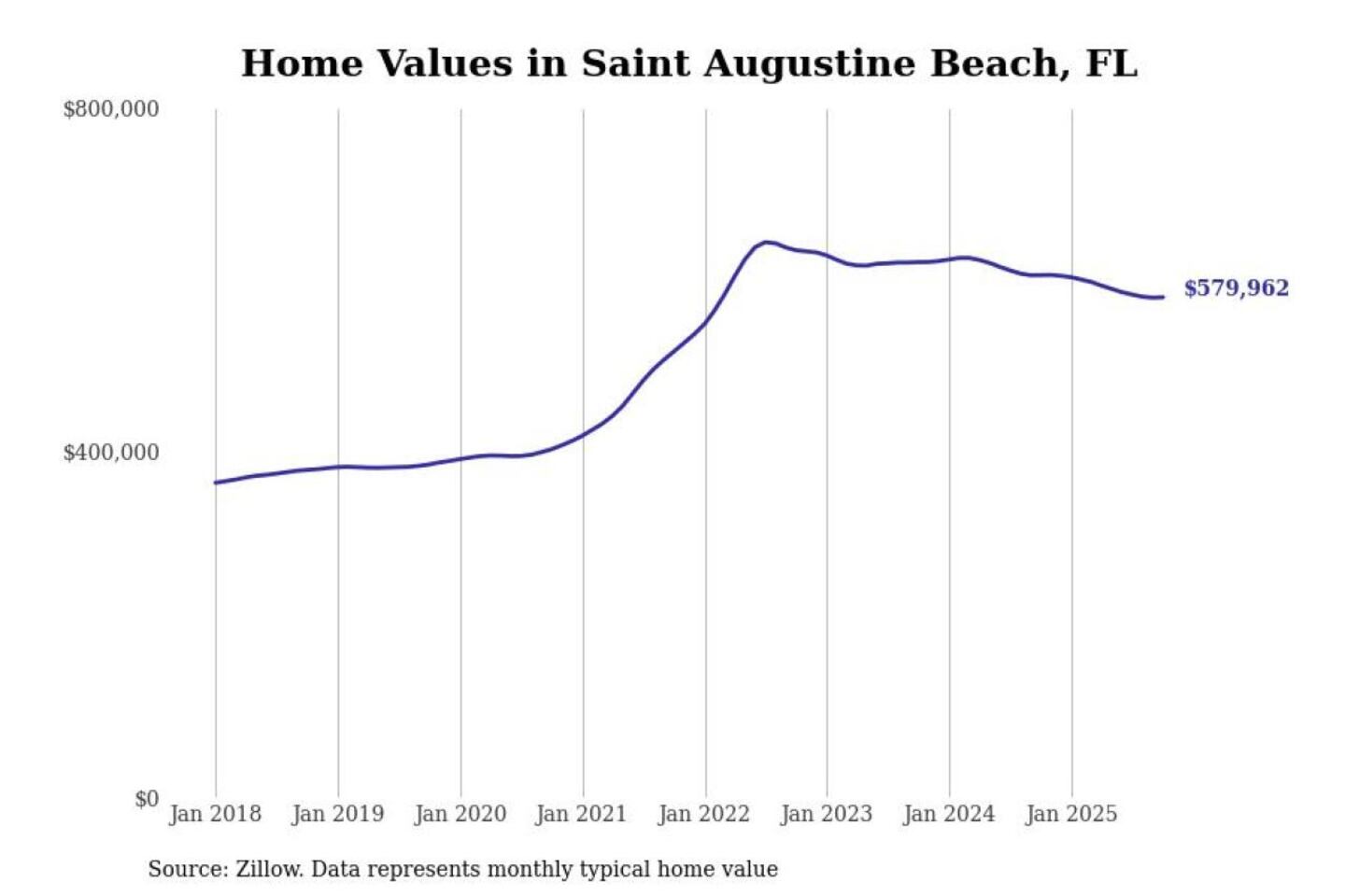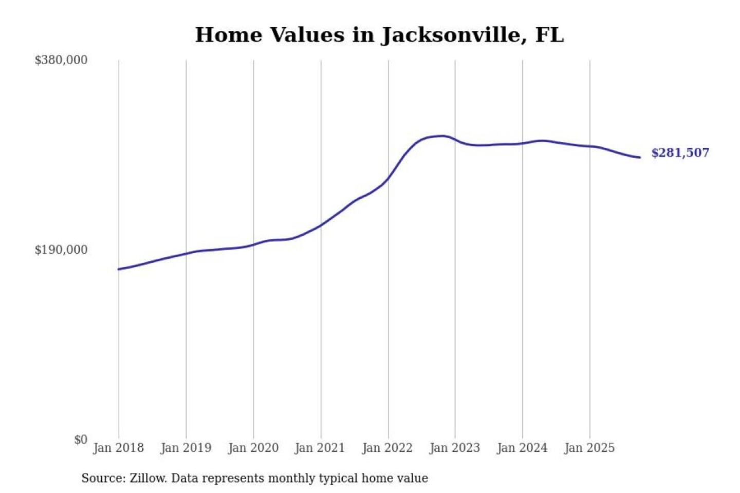 Stacker compiled a list of cities with the most expensive homes in the Jacksonville metro area using data from Zillow. Charts show the monthly typical home value since January 2018. All 27 cities and towns with data available were included in the list.