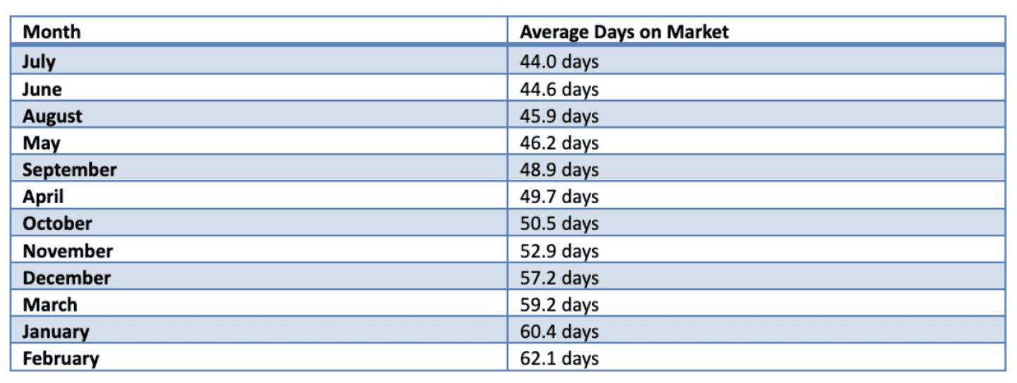 Homes that closed in summer (May through August) spent an average of 45.2 days on market. Homes closing in winter (December through February) spent 59.9 days. That is a 33% penalty for winter sellers.