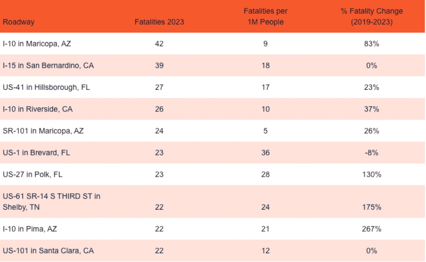 While the most dangerous roads are in large urban areas, there is little correlation between a county’s size and the number of road fatalities—indicating that road design and driving habits are important factors.