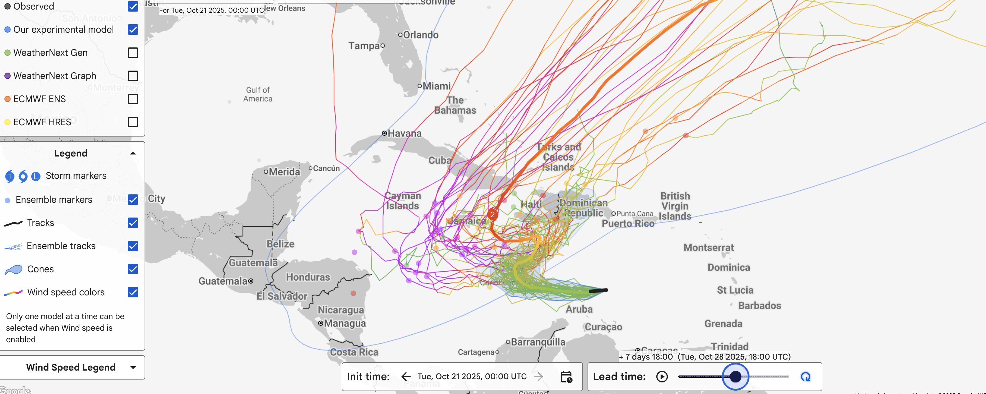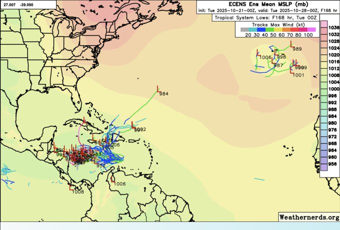 Forecast model ensembles are in two “camps” - one that’s more northeast with an earlier turn vs. a languishing Melissa over the Central, even Western Caribbean: