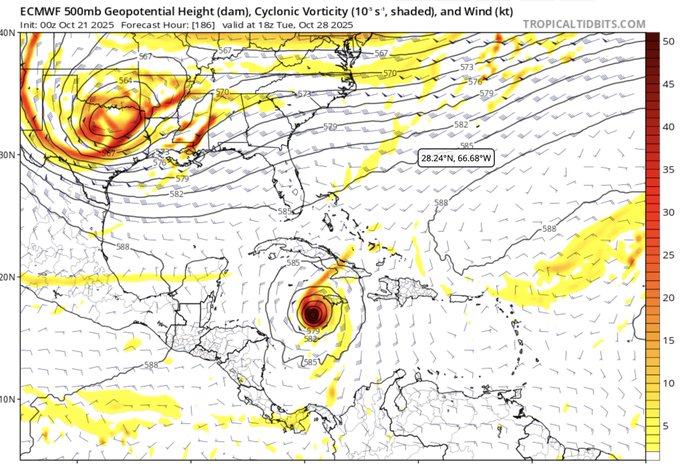 The upper level forecast from the European model for next Tue., Oct. 28 showing a deep trough digging over Texas then should move east & should have a role in Melissa’s movement either over the Caribbean or SW Atlantic depending on exactly where Melissa is located (keep in mind some models are further northeast vs. European for next week):